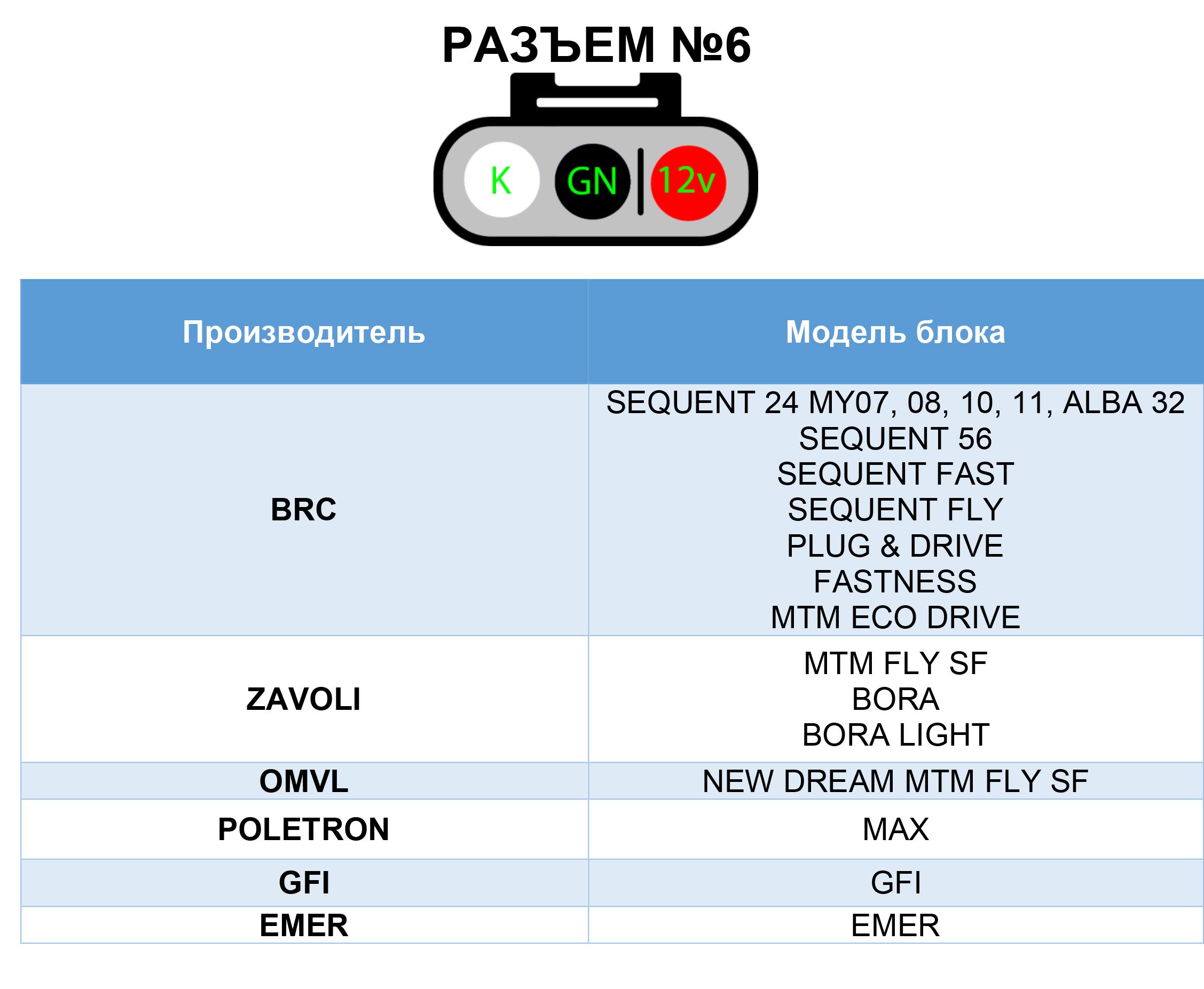 №6 - для систем ГБО BRC / ZAVOLI BORA / OMVL NEW DREAM / POLETRON MAX и другие.